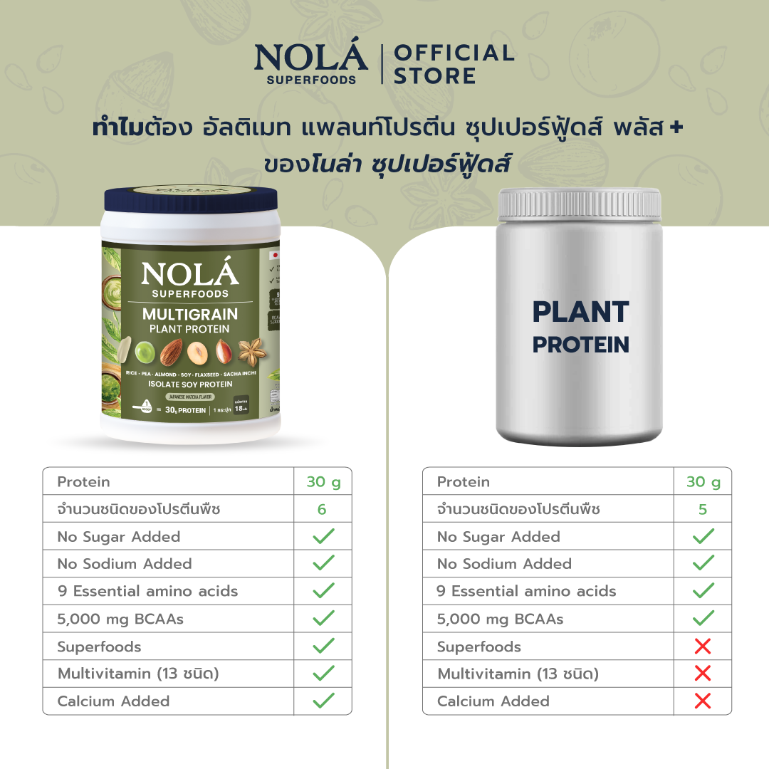 โนล่า อัลติเมท แพลนท์โปรตีน ช่วยเสริมปริมาณโปรตีนที่ร่างกายควรได้รับในแต่ละวัน นอกจากนี้เรายังผสมผสานสารอาหาร Micronutrients จากซุปเปอร์ฟู้ดส์ 4 ชนิด ได้แก่ ผงอาซาอิ ผงมากิ ผงคลอเรลลา และสารสกัดอะเซโรล่าเชอร์รี่ รวมถึงวิตามินรวม 13 ชนิด มีแคลเซียม ช่วยป้องกันการสลายตัวของมวลกระดูกและเสริมสร้างกระดูกให้แข็งแรง มี Prebiotic ซึ่งจะช่วยในเรื่องระบบขับถ่ายและเป็นอาหารให้กับ Probiotic ไม่มีการเติมน้ำตาลและโซเดียม ใช้ Sucralose เป็นสารให้ความหวานที่ไม่กระตุ้นระดับอินซูลิน